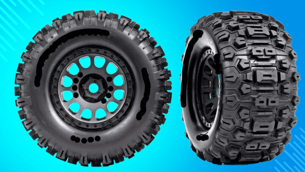 The stock tires on the Traxxas XRT are primarily designed for on-road use, which limits their performance in off-road conditions. To enhance traction and handling on dirt and rough terrain, investing in quality tires is essential. Two excellent options are the Duratrax Six-Pack tires and the Pro-Line MX57 Badlands tires.